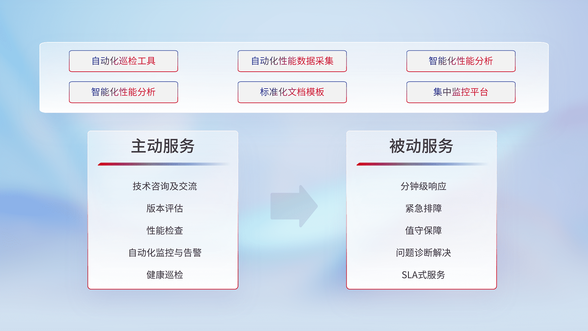 智能化工具和标准化文档,,保障服务质量,,,,提供主动服务(包含技术咨询、、、版本评估、、、、性能检查、、自动化监控与告警、、健康巡检)和被动服务包含(分钟级响应、、紧急排障、、、值守保障、、、、问题诊断解决、、、SLA服务)。。。